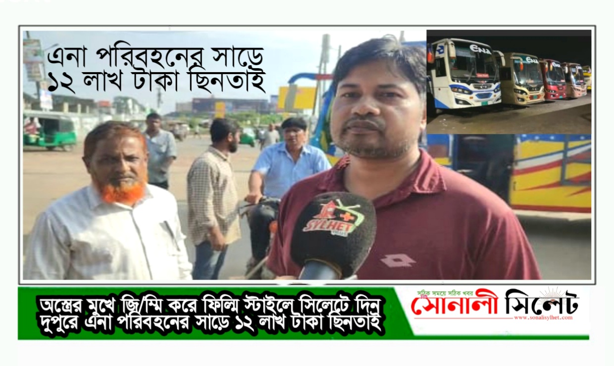 সিলেটের দক্ষিণ সুরমায় রোববার দুপুরে এনা পরিবহনের তিন কর্মচারীর কাছ থেকে মোটরসাইকেলযোগে আসা ছিনতাইকারীরা অস্ত্রের মুখে জিম্মি করে প্রায় ১২ লাখ ৪০ হাজার টাকা ছিনতাই করেছে। ২৬ অক্টোবর ২০২৫,